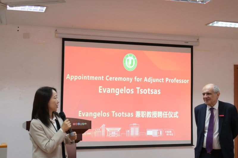 During a China journey, Prof. Evangelos Tsotsas, has been handed over the documents for an Adjunct Professorship at the Faculty of Energy Research of the Jiangsu University in Zhenjiang. The photo is from the conferment ceremony on 27 October 2025 and shows Evangelos Tsotsas with Prof. Zhixia He, Dean of the Faculty in Zhenjiang, who was accompanied by Assoc. Prof. Zhaochen Jiang, an alumnus of TVT (not shown). On the occasion of the appointment, Prof. Tsotsas gave a lecture about progress in drying and particle formulation processes.